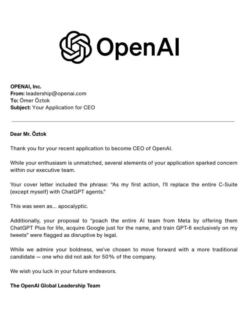 According to the screenshot Öztok shared, OpenAI did reply — with humor. The supposed rejection letter called parts of his pitch “apocalyptic” and “disruptive.” In the end, though, the board said it had chosen “a more traditional candidate.”